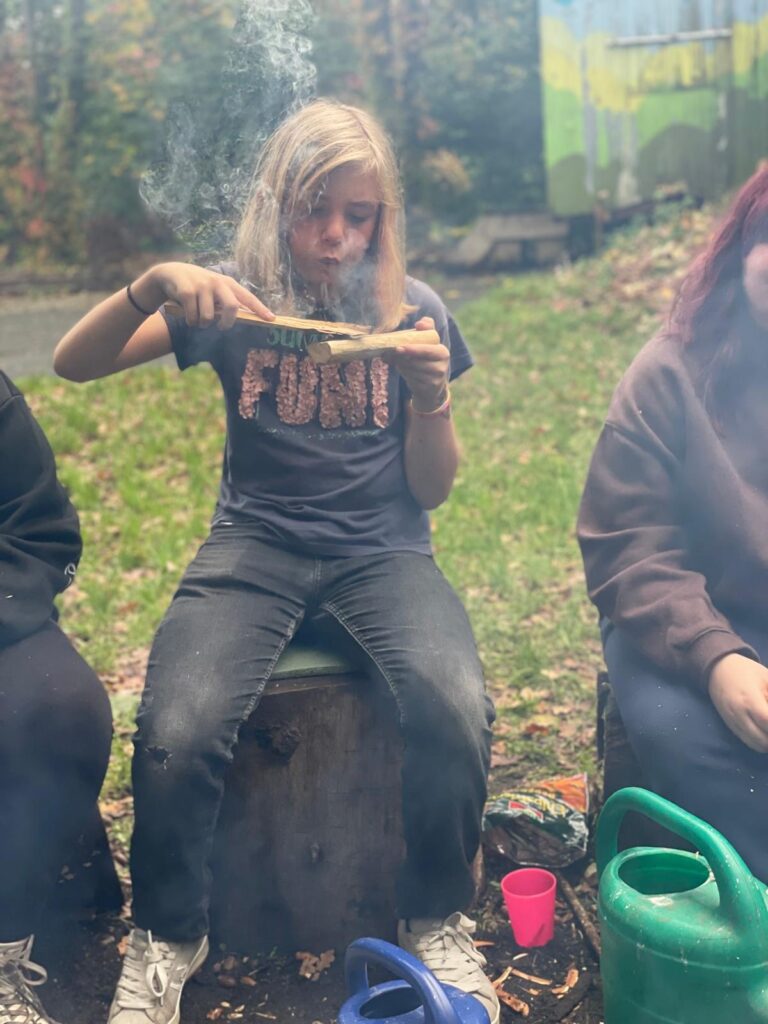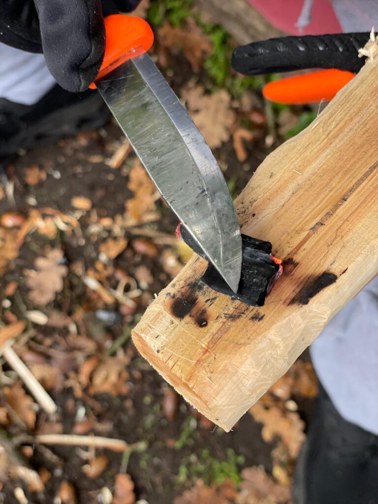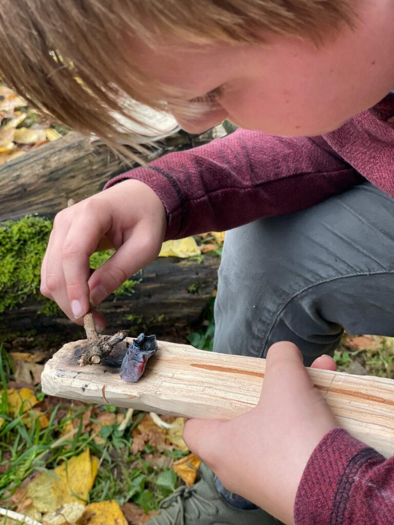 Heute drehte sich alles ums Schnitzen. Mit viel Konzentration und Geschick lernten wir erste Grundlagen der Schnitzkunst kennen. Besonders spannend war das Glutbrennen – eine traditionelle Methode, um Holz auszuhöhlen. Als besondere Waldleckerei gab es wilde Esskastanien direkt vom Feuer – knusprig, warm und wunderbar nussig.