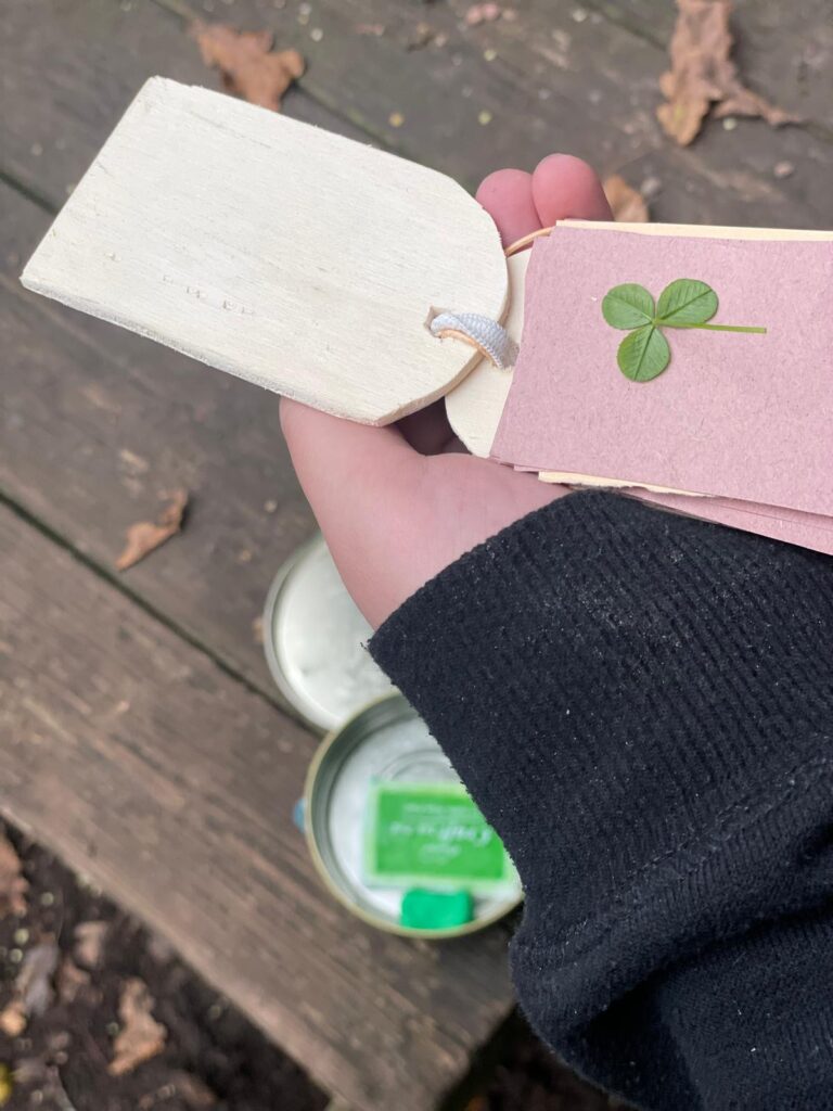 Heute wurde gebaut und gesucht! Wir stellten eigene Blüten- und Blattpressen für unterwegs her – ideal, um unsere Funde haltbar zu machen. Auf der Suche nach Kleeblättern und anderen Wiesenpflanzen wurde eifrig gesammelt. Dabei wurden sogar etliche 4-blättrige Kleeblätter gefunden, die bekanntlich Glück bringen werden. Sicherlich werden, nach ausreichender Trockenzeit, auch diese Schätze in den Tagebüchern verewigt.