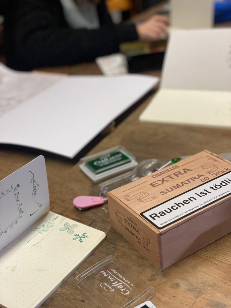 Ausgestattet mit einem selbst gestalteten Waldtagebuch starteten wir kreativ in den Tag. Wir bastelten Stempelkissen-Dosen und gingen auf Streifzug in die Natur. Dabei sammelten wir die unterschiedlichsten Strukturen, die wir auf Bäumen, Steinen und Pflanzen finden konnten.