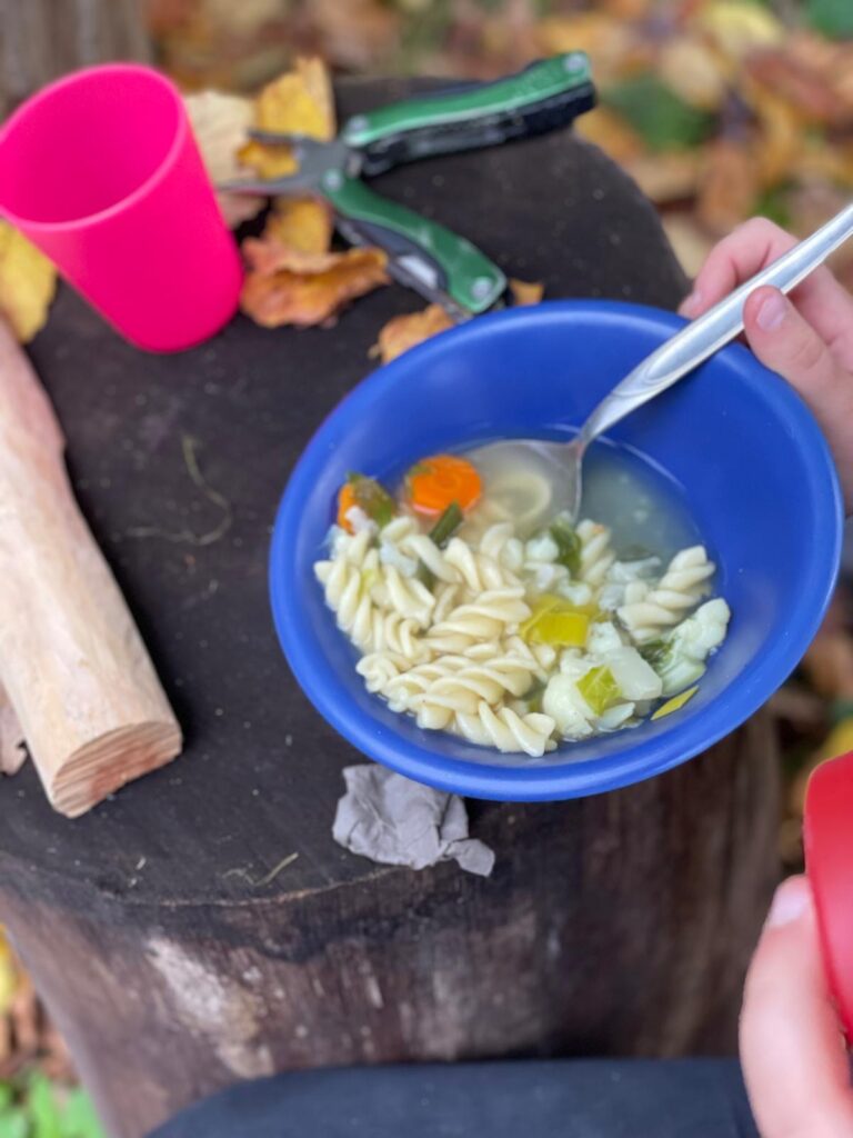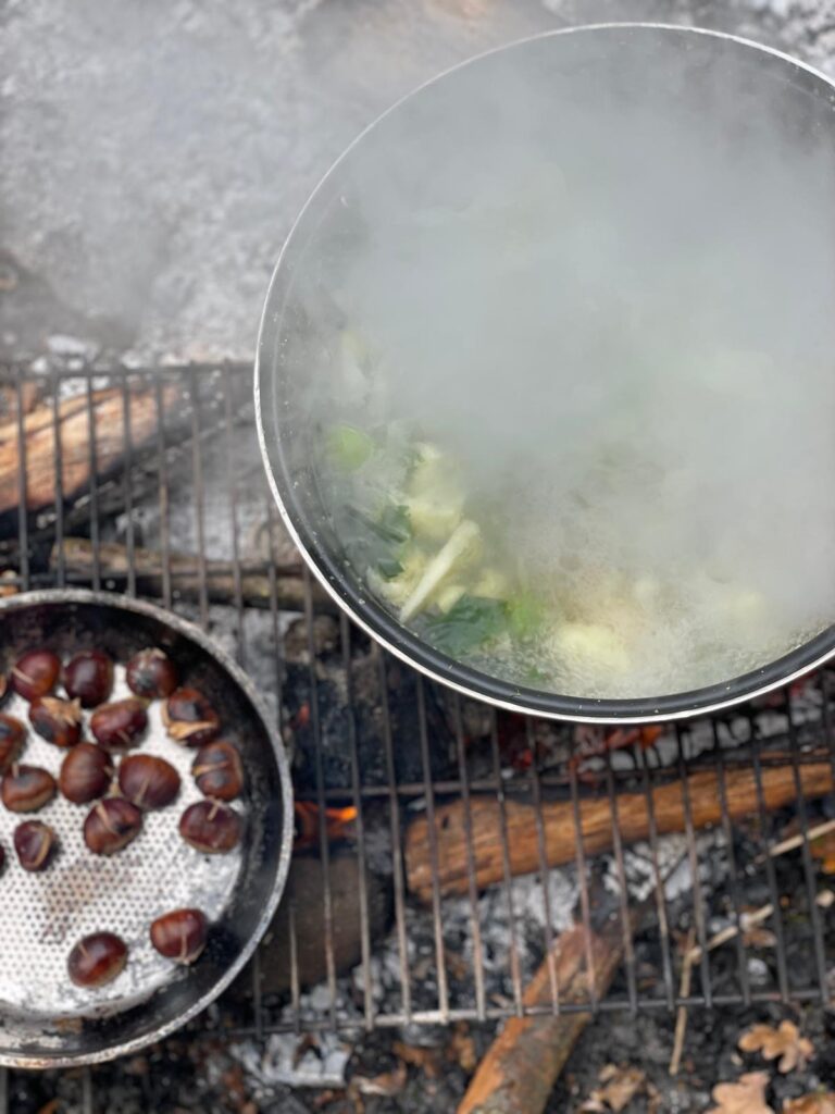 Mittags duftete es dann herrlich aus der wilden Feuerküche: Gemeinsam kochten wir eine Brennnesselgemüsesuppe – mutig probiert und von vielen für lecker befunden!